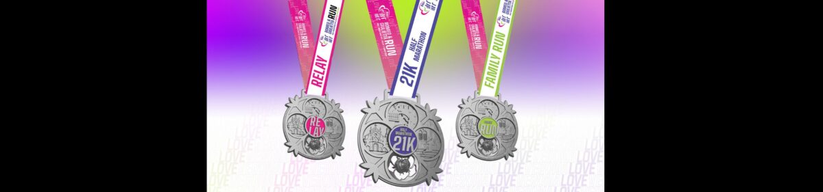 Per ciascuna delle distanze, al centro è riportato il nome dell’evento inciso in un cerchio colorato in pendant con il cordino. Viola per la Half Marathon, rosa per la Relay e verde per la Family Run. Tutta la medaglia è realizzata sul motivo delle arche scaligere. Sul retro sono riportati il nome e la data della gara e le parole chiave “Coraggio, amore, passione” che descrivono le caratteristiche di un runner, in analogia con quelle degli innamorati.