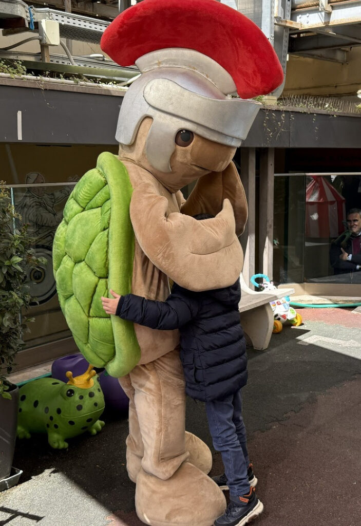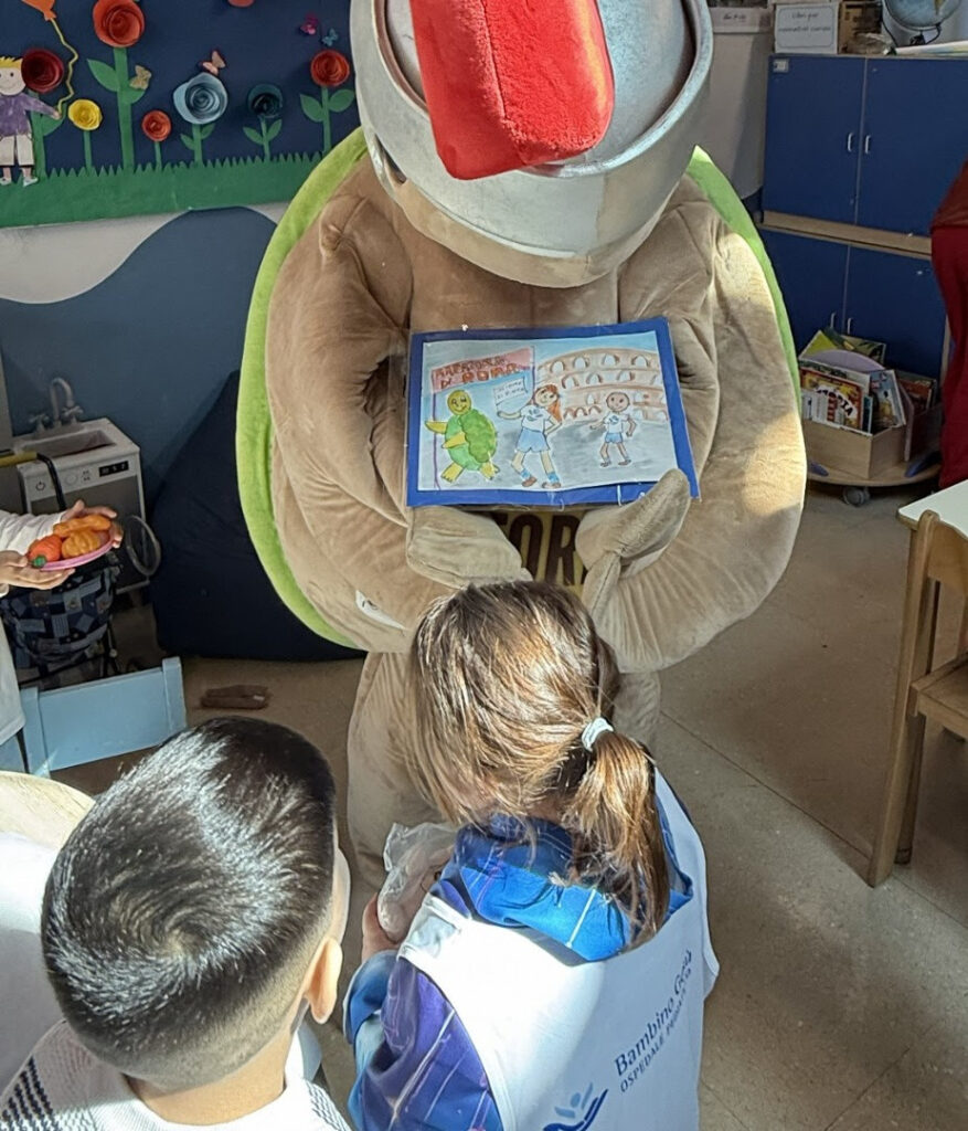 Una sorpresa per i bambini presenti nella Ludoteca della sede del Gianicolo che si sono intrattenuti a lungo con la grande tartaruga che “va piano ma vince sempre”. La mascotte ha ricevuto in dono “cibo”, allegria, curiosità e un disegno che ricorda a tutti che per vincere bisogna essere insieme, uniti. Poi i discorsi sul futuro: la piccola Agnese ha confidato a Vittoria che da grande farà la “dottoressa dei piccoli e sarà la più brava di tutti”; Samir, invece, diventerà un poliziotto e anche un artista. Gioia, con orgoglio, ha voluto presentare alla mascotte il suo papà maratoneta.